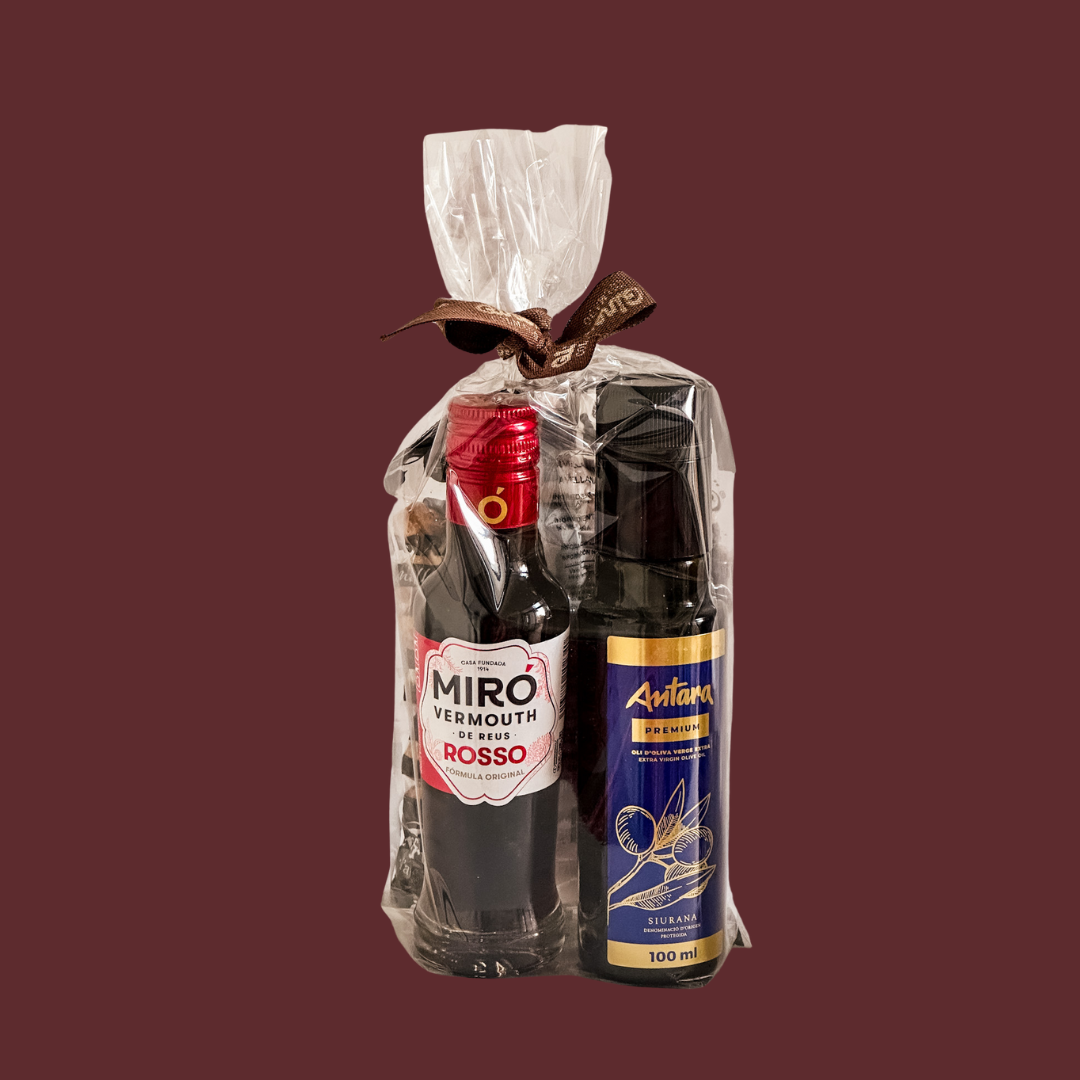 Submergeix-te en l’essència de la cuina mediterrània amb aquest lot dissenyat per a gaudir-se en qualsevol moment. Inclou avellanes torrades, oli verge extra ecològic 100% d’arbequina (10cl) i vermut de Reus negre Miró (10cl).